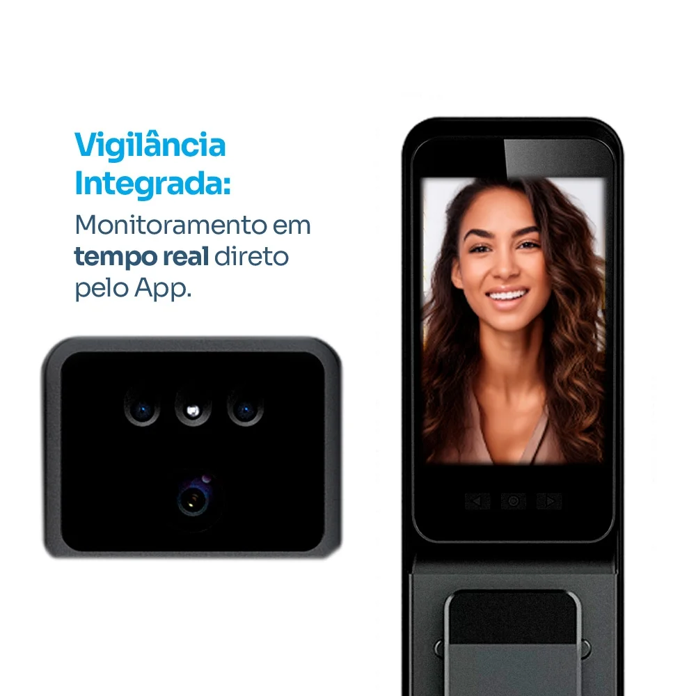 Este modelo funciona como um sistema de vigilância constante, unindo uma câmera integrada a sensores de detecção inteligente. Você pode monitorar a frente da sua casa em tempo real pelo aplicativo, enquanto a fechadura identifica sua presença para agilizar a entrada. É a união perfeita entre máxima resistência física e vigilância tecnológica para garantir a proteção total da sua família, permitindo visualizar quem está à porta antes mesmo de liberar o acesso.