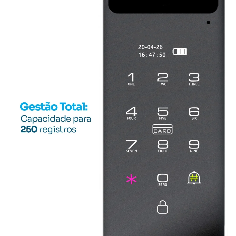 O controle total do seu lar está na palma da sua mão através da conectividade completa da KABUM! smart Security. Com Wi-Fi integrado, você gerencia permissões diretamente pelo aplicativo, de qualquer lugar do mundo. A quantidade de desbloqueios é um destaque, oferecendo múltiplos métodos de verificação como biometria digital, senha, cartão, chave mecânica, APP remoto e até reconhecimento facial. Com capacidade para até 250 usuários cadastrados (entre face, digital, senha e cartão), ela atende perfeitamente desde residências até pequenos escritórios com a qualidade garantida que a marca oferece.
